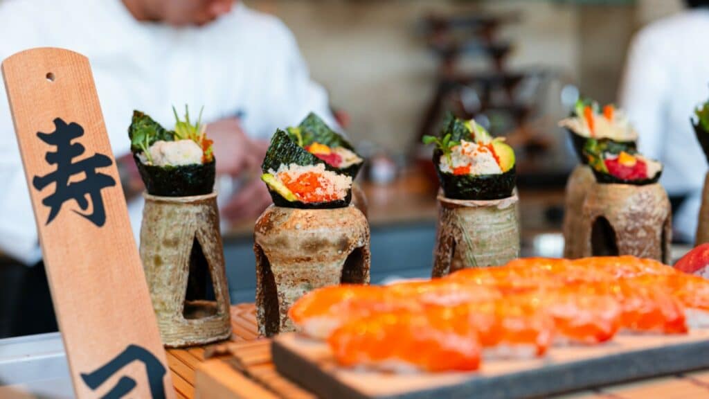 The live stations are a visual highlight, bringing the theatre of Japanese cooking to life. Guests can enhance their experience with a choice of three beverage packages: a non-alcoholic selection, house wines and beer, or a champagne and sake pairing option for a truly elevated afternoon.