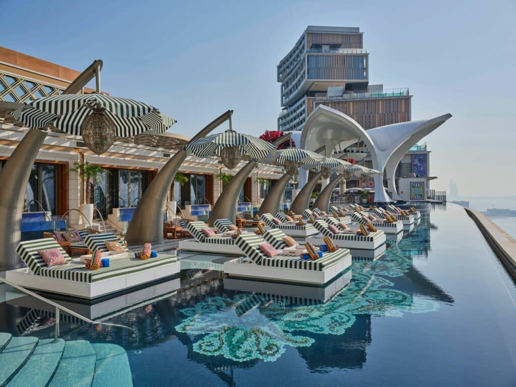 Located on the 22nd floor of Atlantis The Royal, Cloud 22 is a panoramic pool offering breathtaking views of the Palm Islands, the Arabian Sea, and the Dubai skyline. Soaring 96 meters above The Palm and spanning 90 meters in length, Cloud 22 blends a sophisticated and upscale vibe with luxurious areas including an endless infinity pool, floating beds, 11 luxury cabanas with private plunge pools, a two-storey VVIP cabana complete with its own floating infinity pool – creating a truly unique ambiance at the heart of one of the world’s most prestigious destinations.
