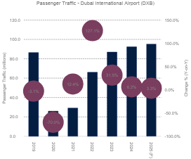 - UAE airports welcomed almost 103 million passengers – a 5.3% rise on last year, with Dubai International Airport (DXB) handling the majority.