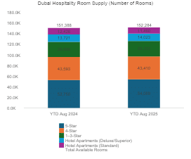 Between January and August, premium segments accounted for the majority of supply, with 54,100 rooms in the 5-star category and 43,400 in 4-star hotels. Together, they made up almost two thirds (64%) of Dubai’s total hotel stock, the company said.